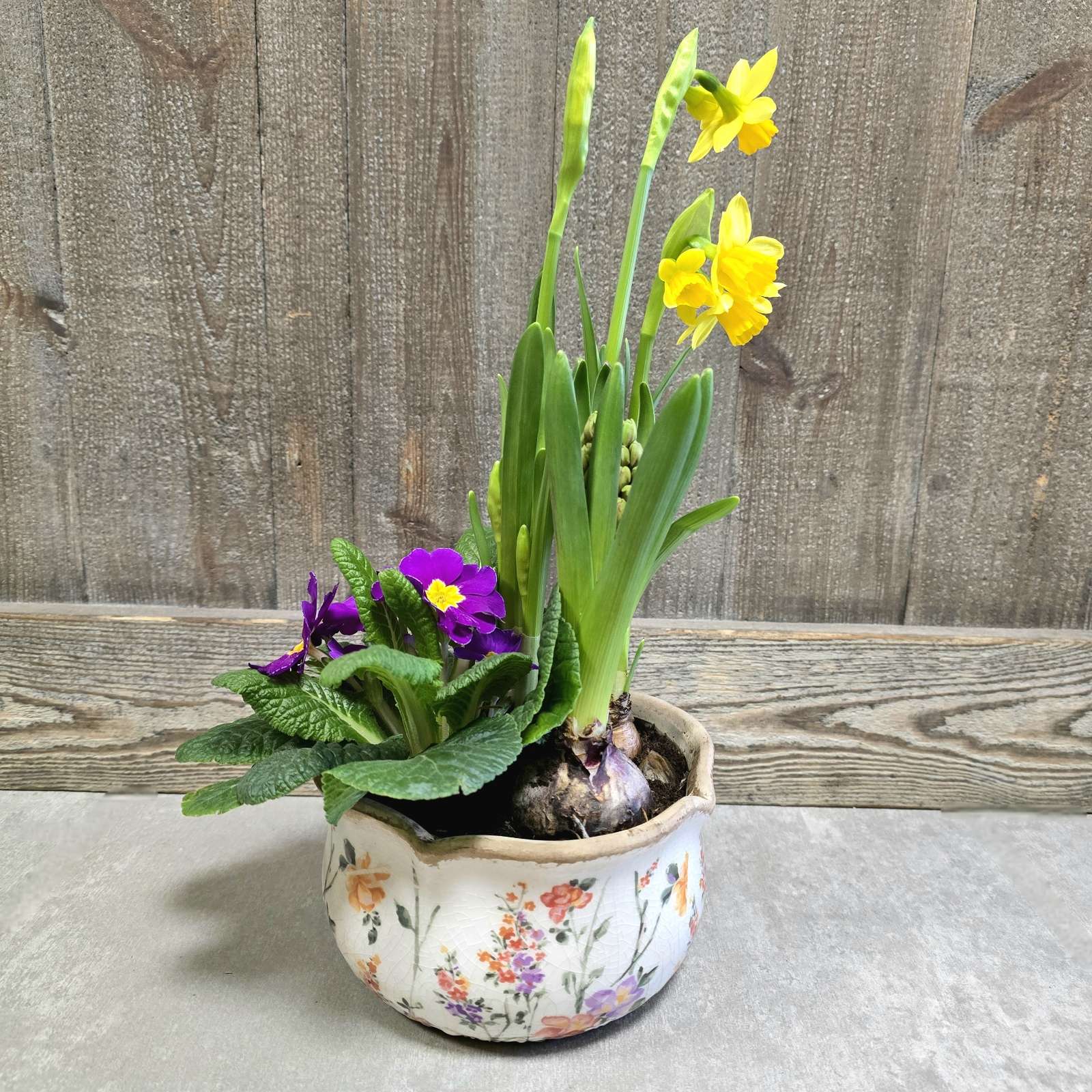 Jolie composition de plantes de printemps (jacinthe, narcisses, primevère...) dans une coupe en céramique aux allures champêtres. Diamètre de la coupe : 20 cm environ.