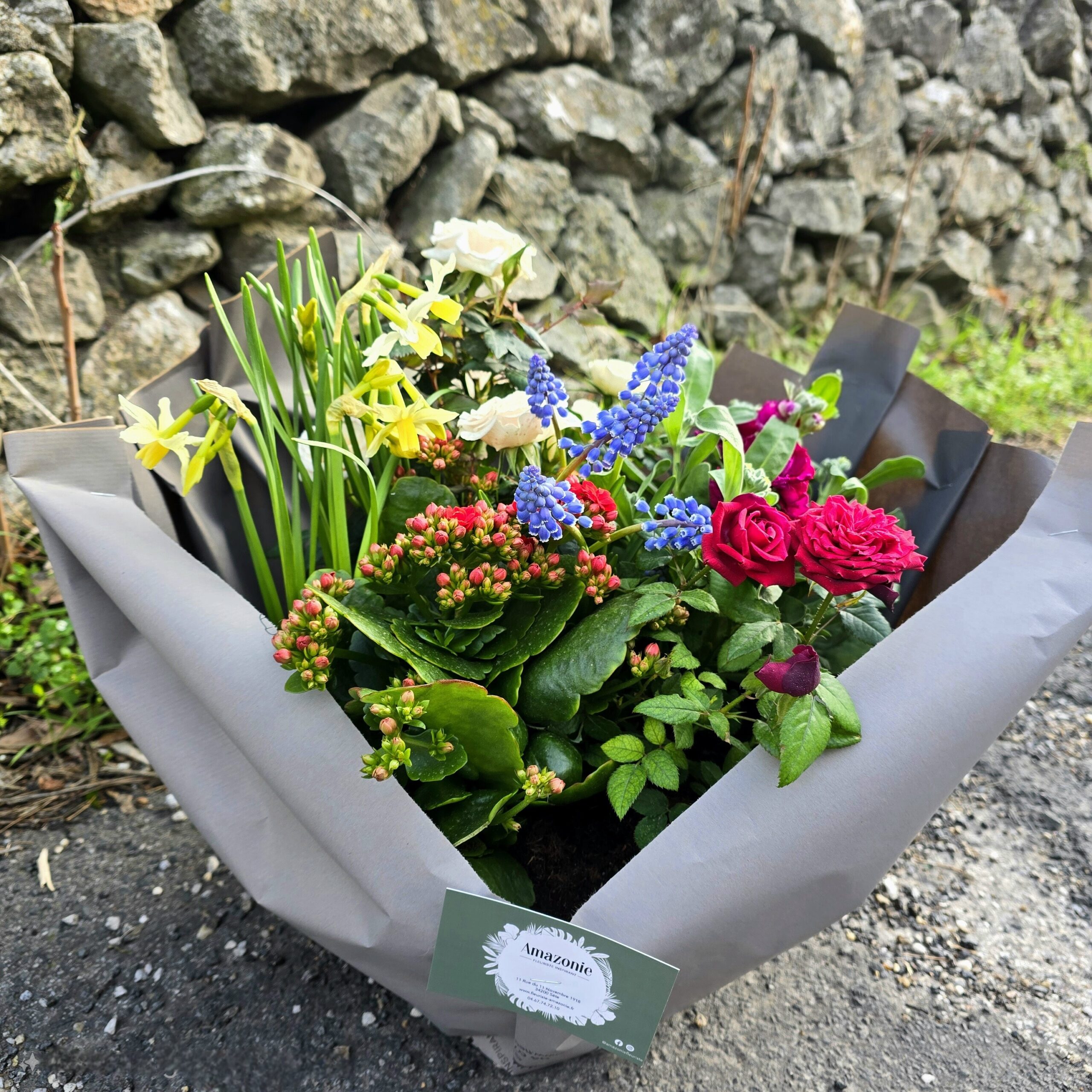 Un arrangement planté de plantes de printemps dont des bulbes fleuris aux couleurs multiples.