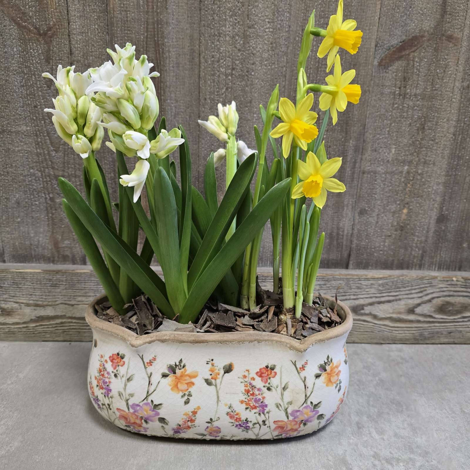 Une magnifique jardinière en céramique aux motifs champêtres recueillant des bulbes de printemps pour une floraison abondante et parfumée !
