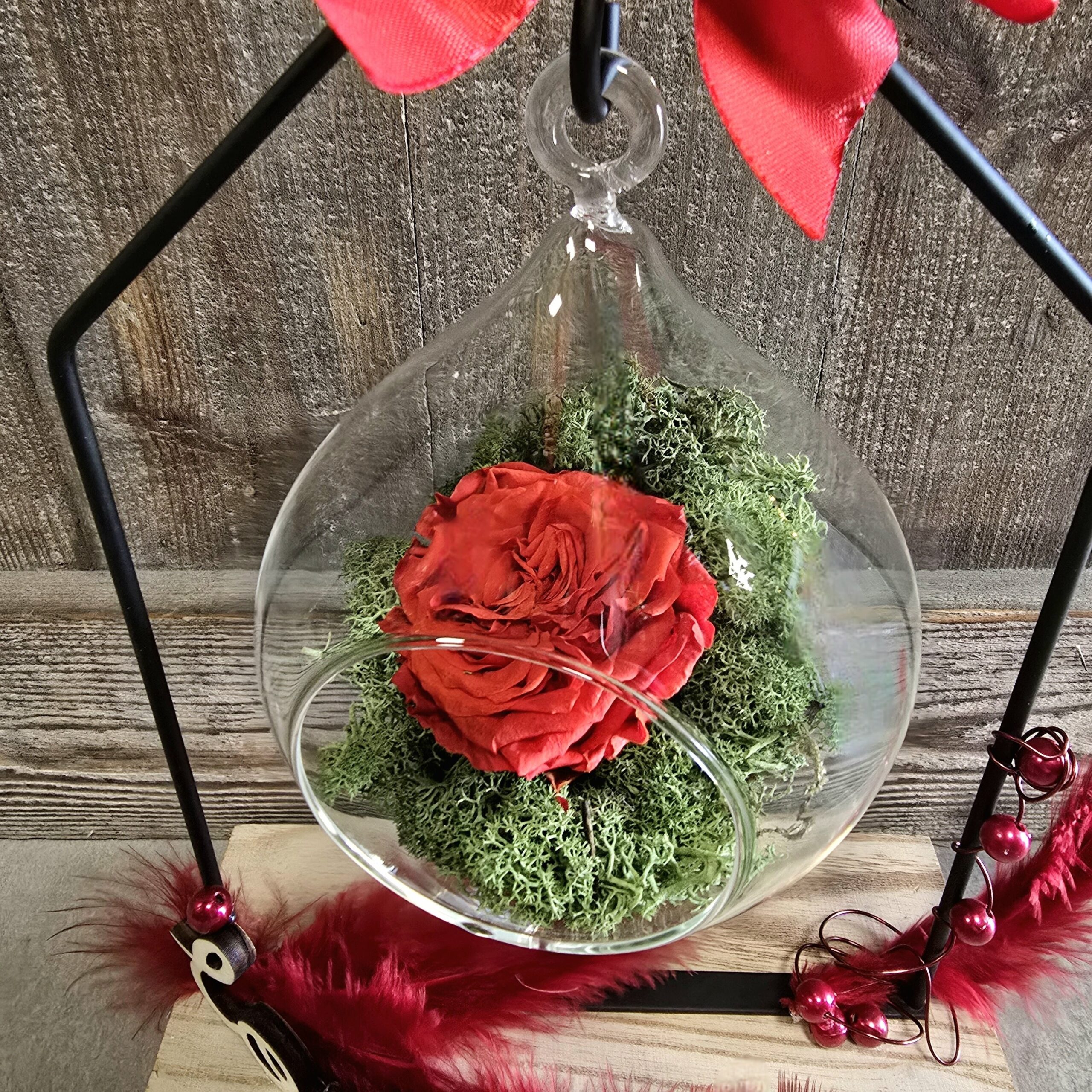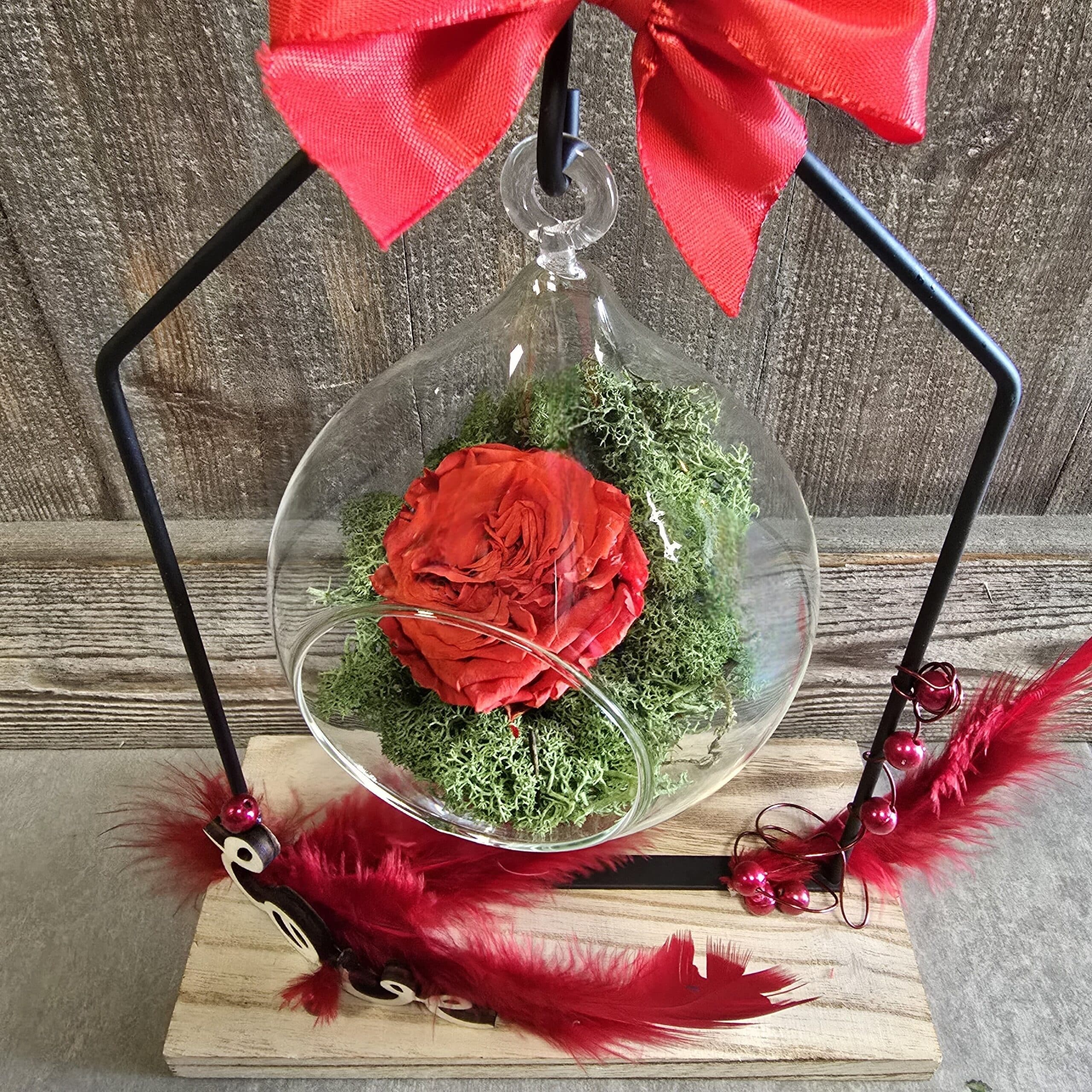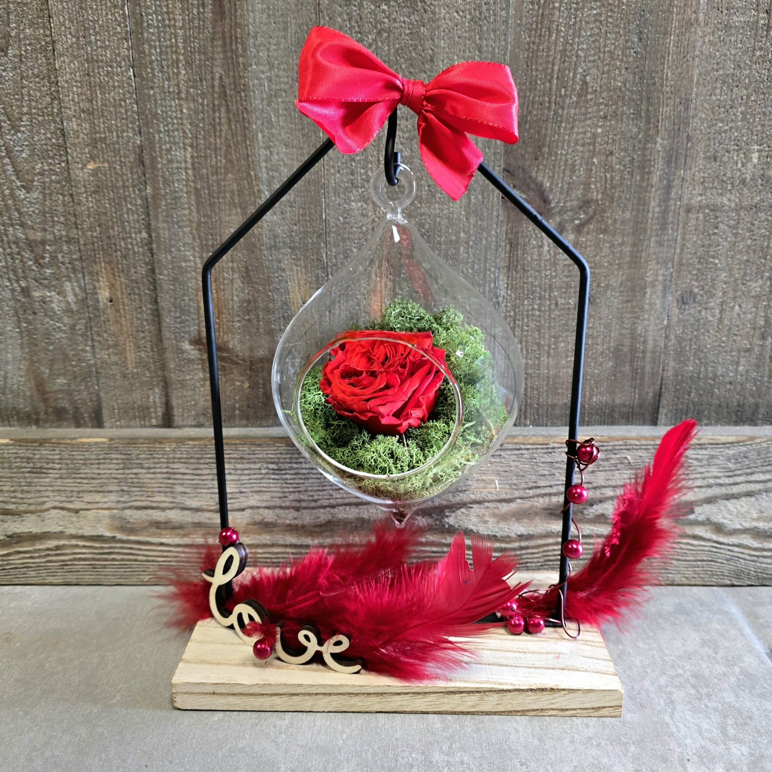 Un bel objet de décoration mettant en valeur une rose éternelle rouge dans un univers de cabaret parisien. Cet pièce unique est réalisée par nos soins.