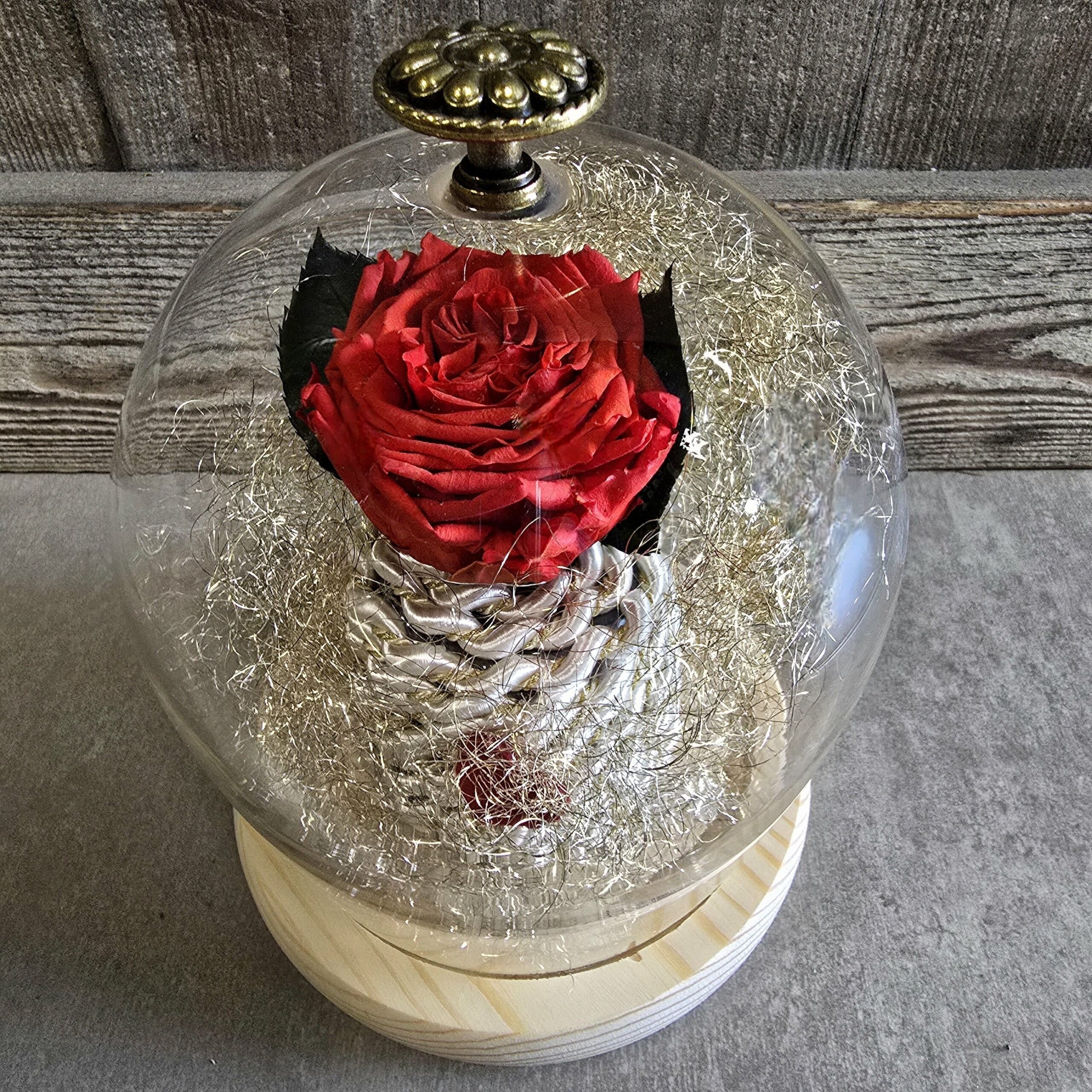 Une belle rose éternelle sublimée par un univers doré et mise en valeur dans une cloche en verre pour le plus bel effet. Cet objet de décoration unique est réalisé par nos soins.