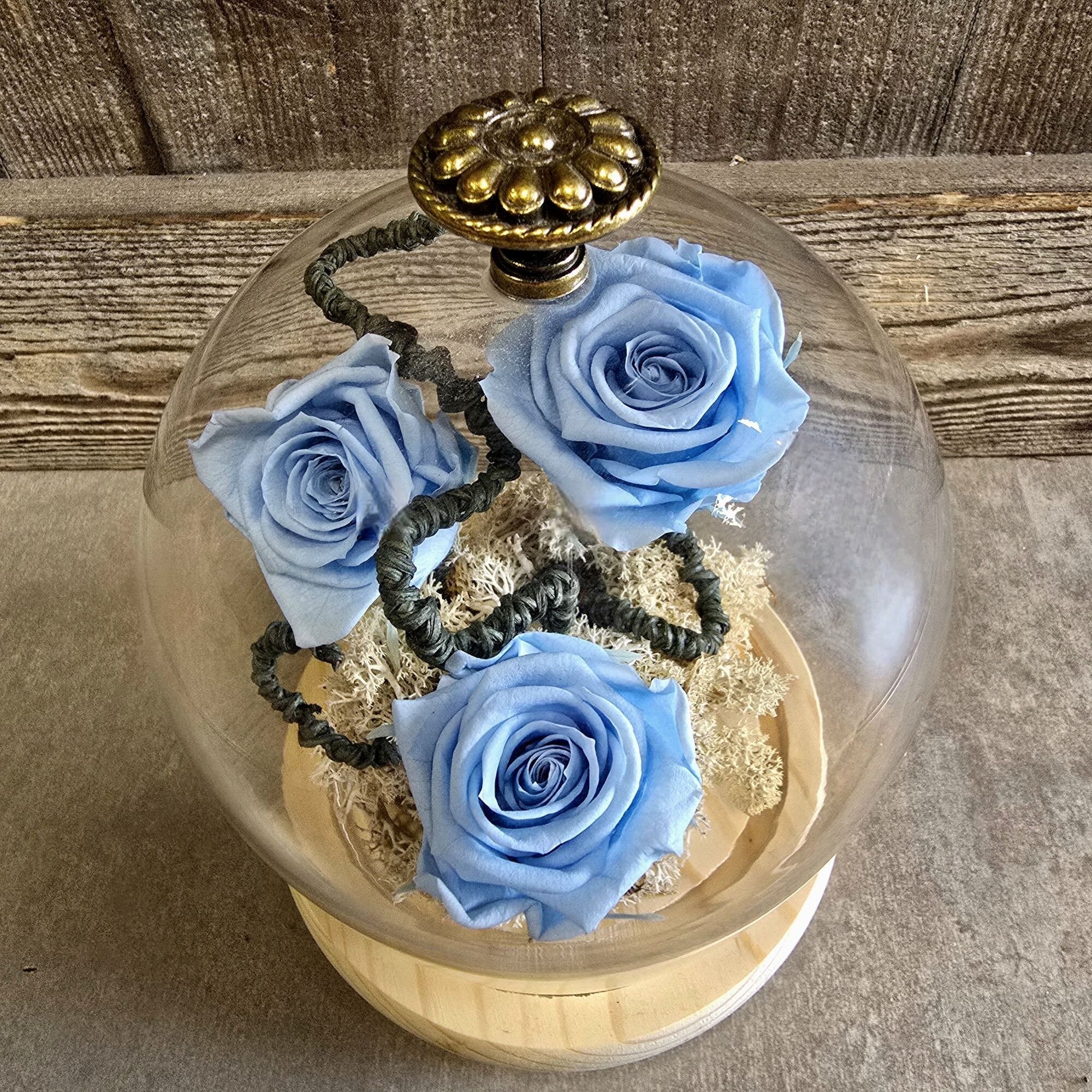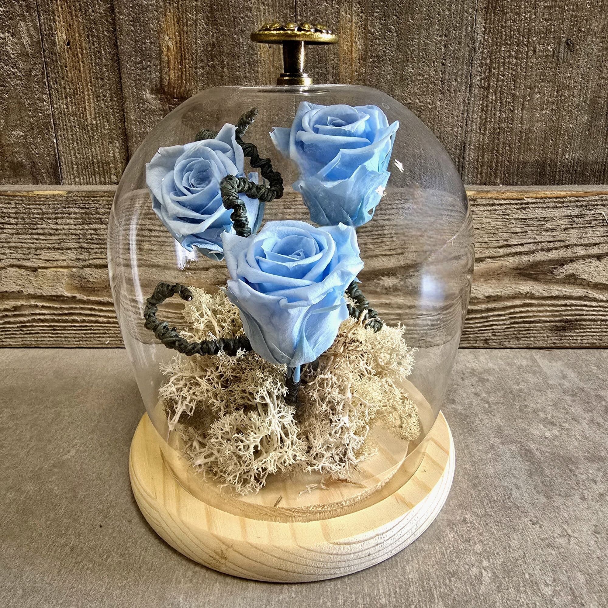 Une cloche de verre renfermant une originale composition de roses éternelles bleu pastel pour le plus bel effet. Un objet de décoration unique entièrement réalisé par nos soins.