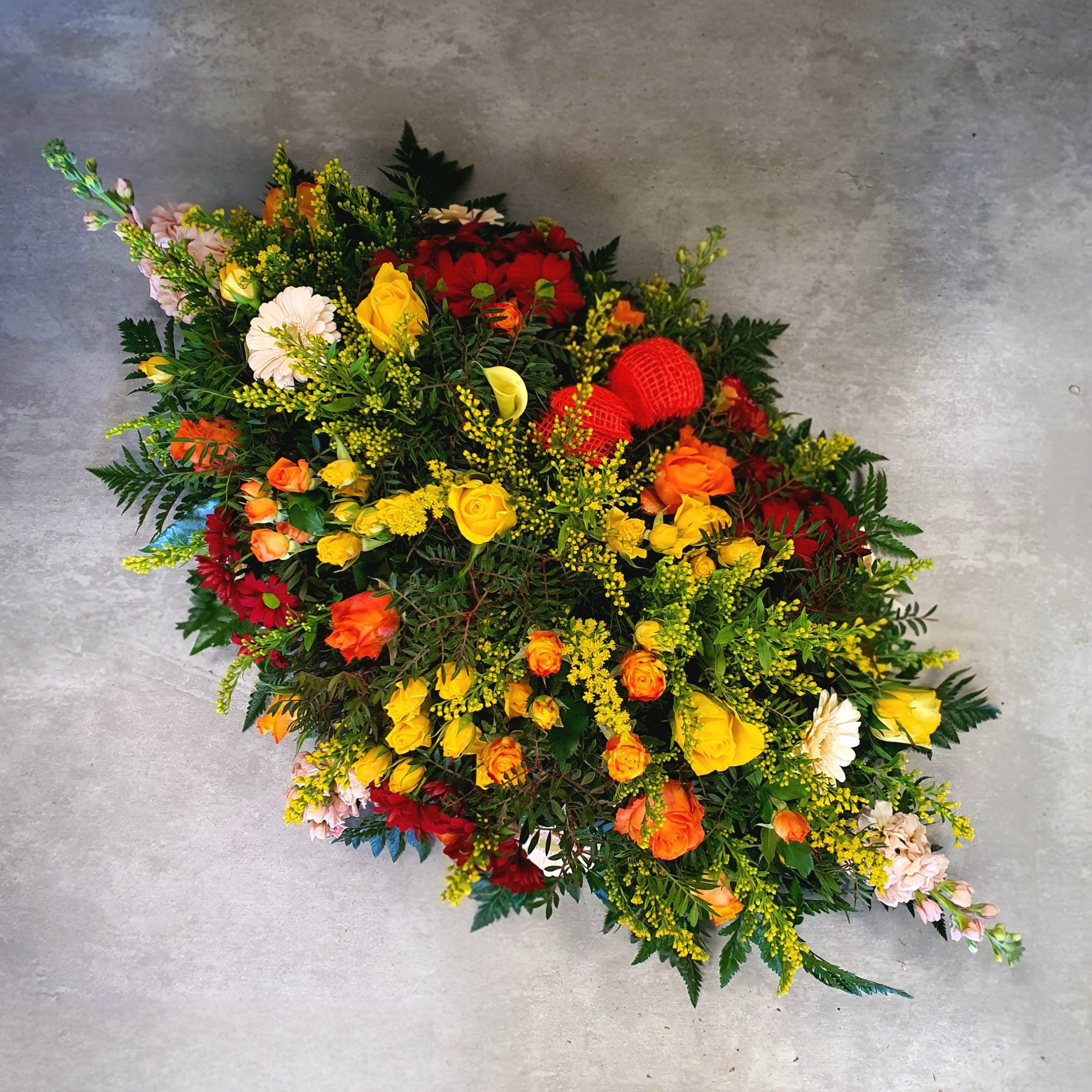 Cette composition florale de forme allongée exprime un hommage fort et respectueux au proche disparu. Les fleurs de couleurs jaune et orange apporte un soutien chaleureux à la famille de la personne disparue.