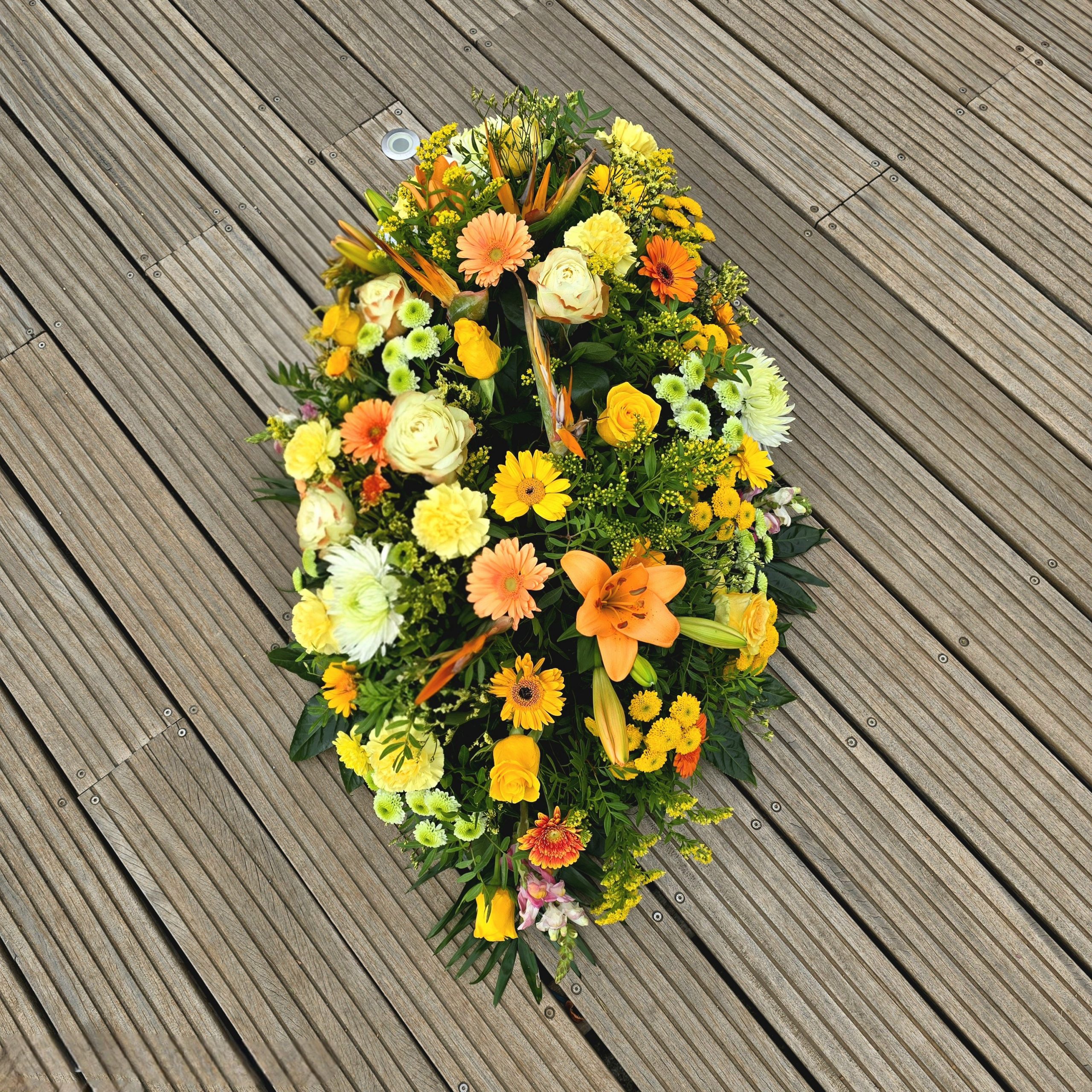 Cette composition florale de forme allongée exprime un hommage fort et respectueux au proche disparu. Les fleurs de couleurs jaune apportent un soutien chaleureux à la famille de la personne disparue.